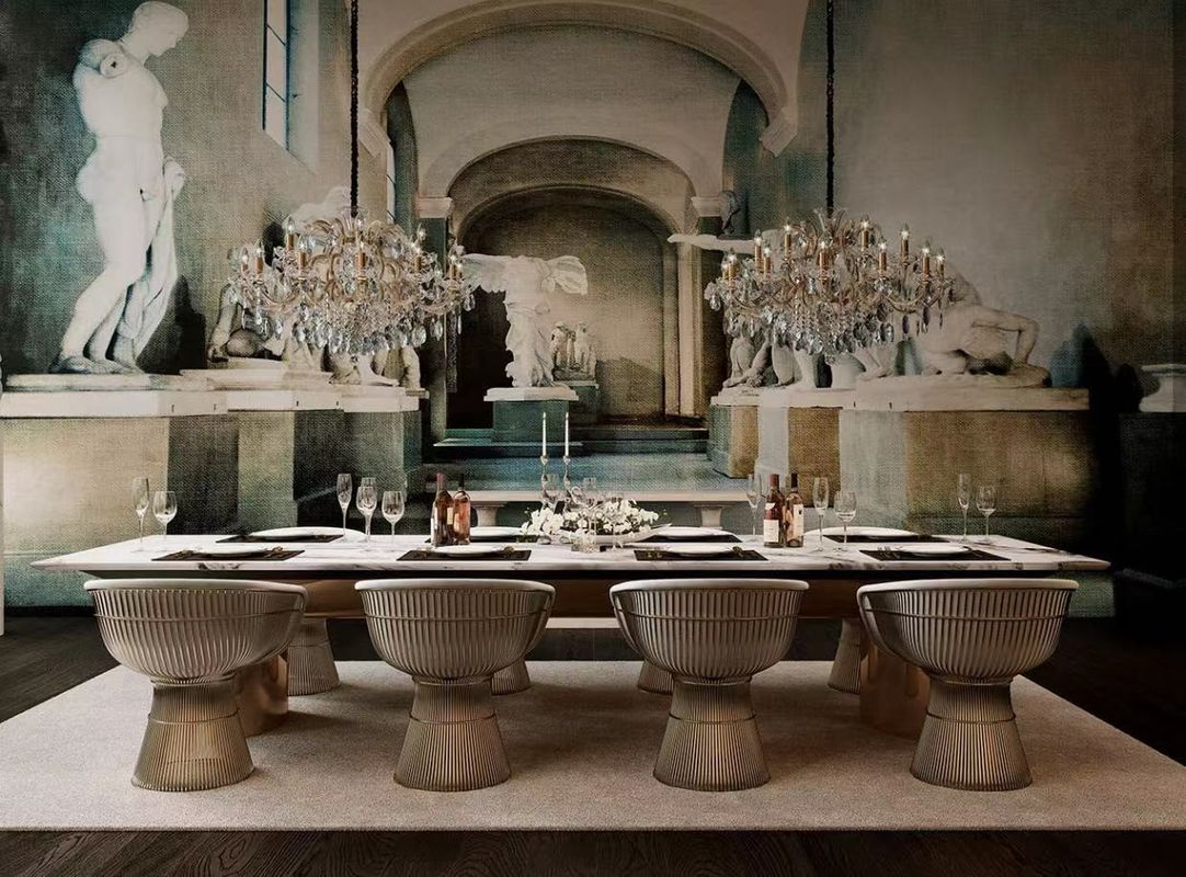 Firstly, let's focus on the white marble table top, which is a work of art. The texture and ambience of the rectangular marble will add a sense of luxury to your dining experience. Every time you sit at this table, you will feel the unique banquet atmosphere.